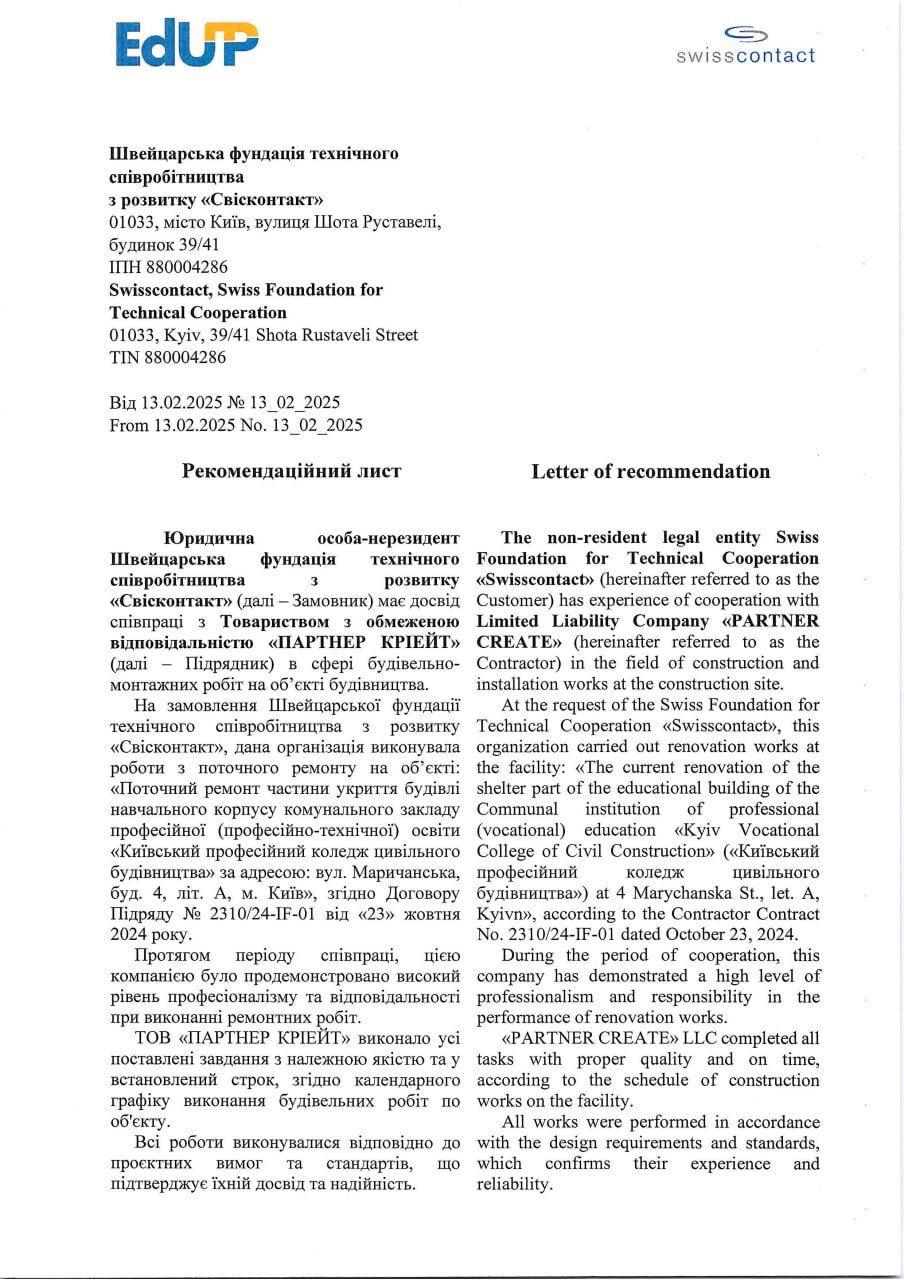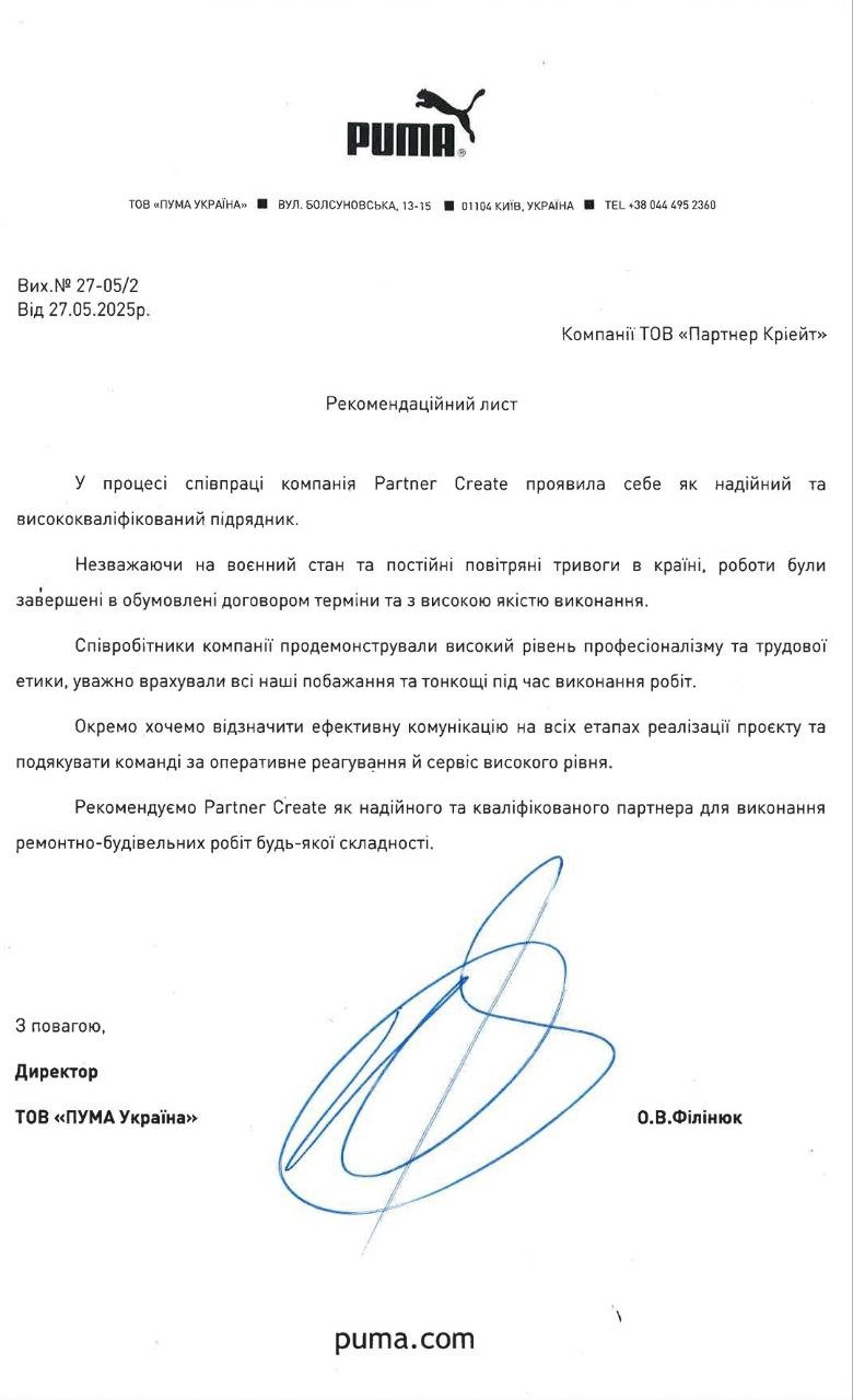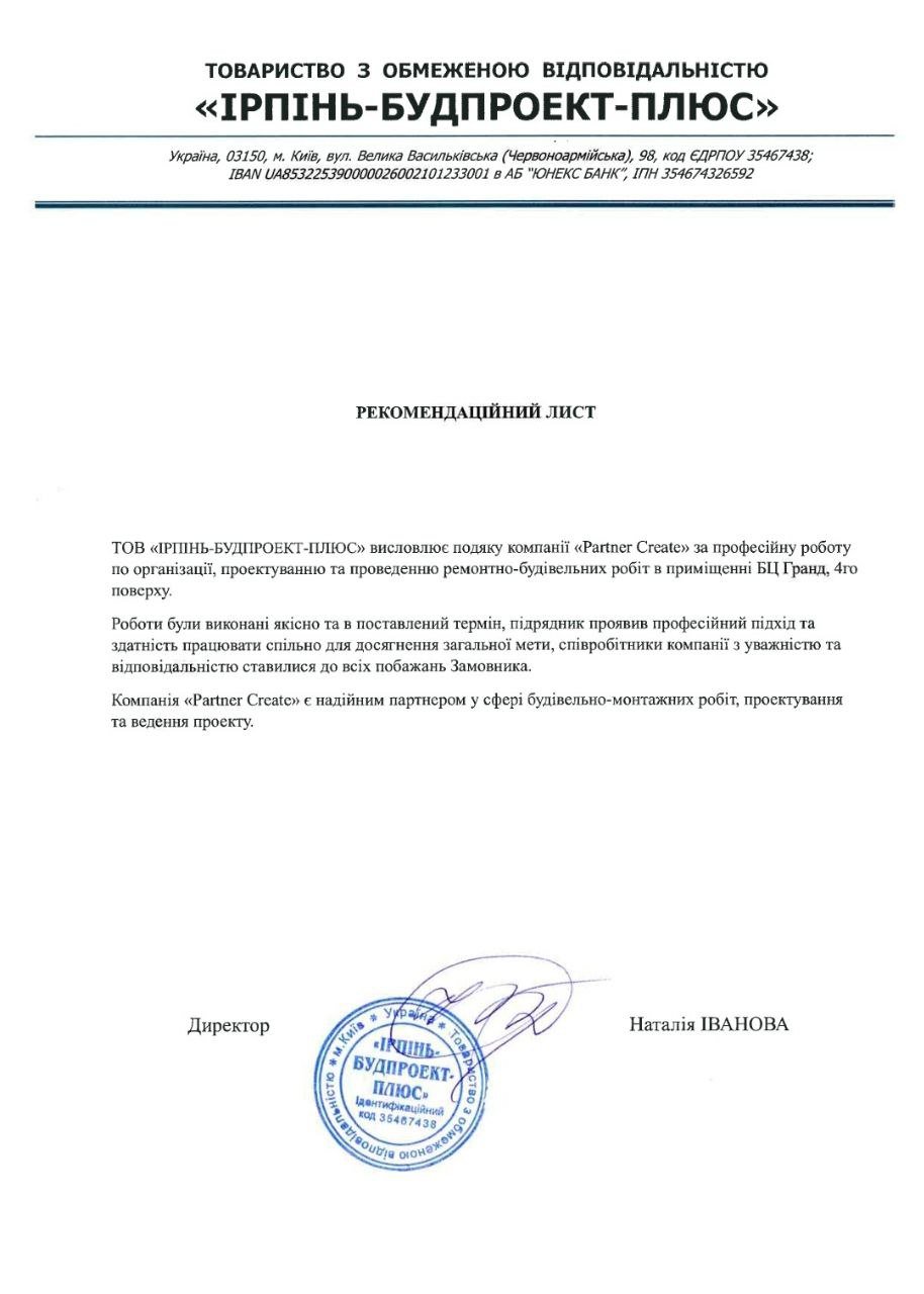 Partner Create is part of the group, which unites enterprises that provide a full range of services for design and engineering, repair and construction work, the manufacture of office furniture and light-transparent structures.